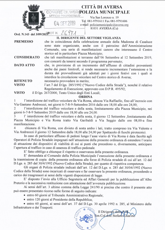 Questa l'ordinanza del Comune di Aversa che chiude le strade per la celebrazione della Madonna di Casaluce