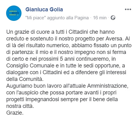 Il giorno dopo la sconfitta elettorale, Ginaluca Golia ha voluto esprimere questo suo pensiero sul profilo Fb