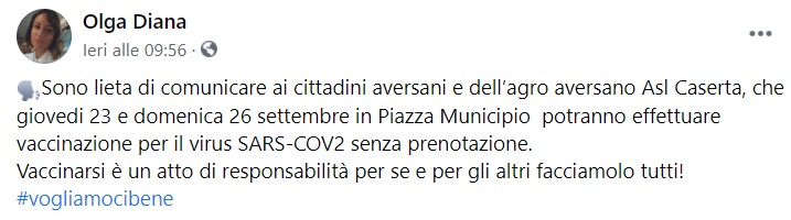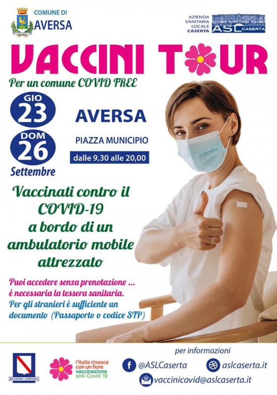 Questo quanto apprendiamo dalla pagina fb della Consigliere Provinciale e Comunale di Aversa Diana: "Sono lieta di comunicare ai cittadini aversani e dell’agro aversano Asl Caserta, che giovedi 23 e domenica 26 settembre in Piazza Municipio potranno effettuare vaccinazione per il virus SARS-COV2 senza prenotazione. Vaccinarsi è un atto di responsabilità per se e per gli altri facciamolo tutti!"