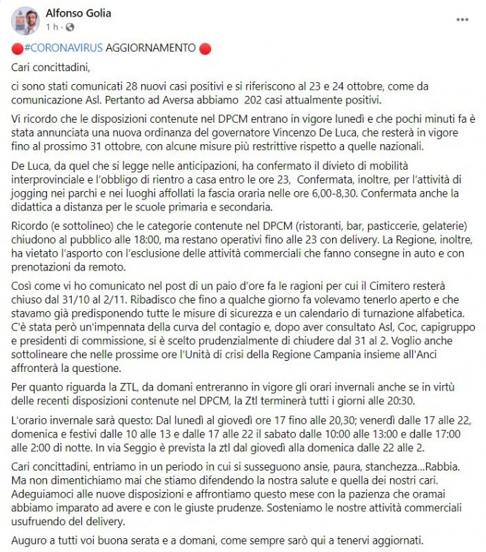 Questo quanto pubblicato sulla pagina fb del Sindaco Golia