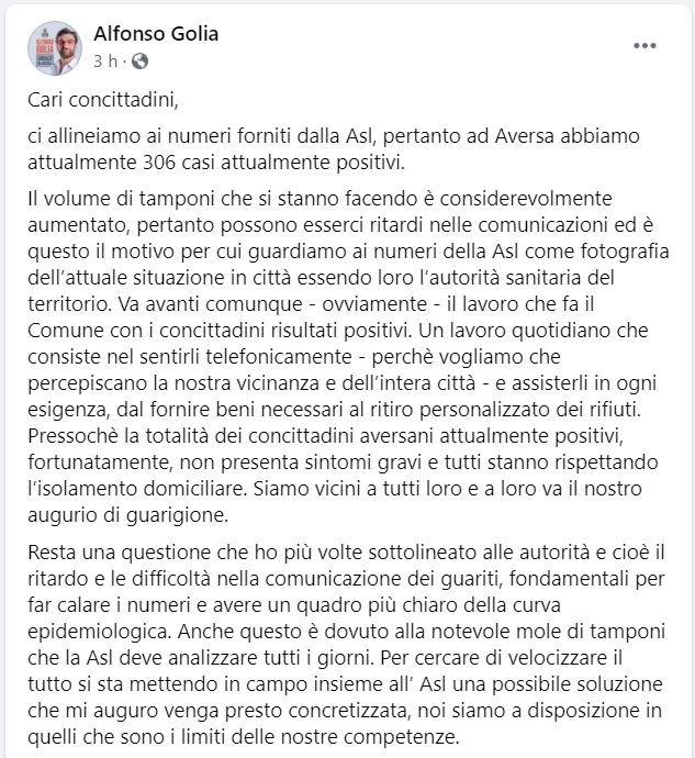 Questo quanto pubblicato sulla pagina facebook del Sindaco Golia