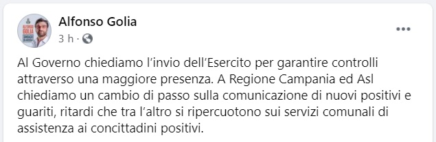 Questo quanto pubblicato sulla pagina fb del Sindaco Golia