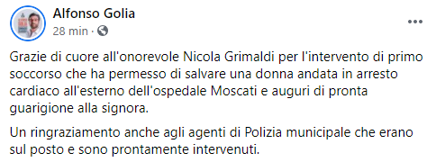 Questo il post pubblicato dal Sindaco di Aversa Alfonso Golia sulla sua pagina Facebook: "Grazie di cuore all'onorevole Nicola Grimaldi per l'intervento di primo soccorso che ha permesso di salvare una donna andata in arresto cardiaco all'esterno dell'ospedale Moscati e auguri di pronta guarigione alla signora. Un ringraziamento - prosegue il post - anche agli agenti di Polizia municipale che erano sul posto e sono prontamente intervenuti".