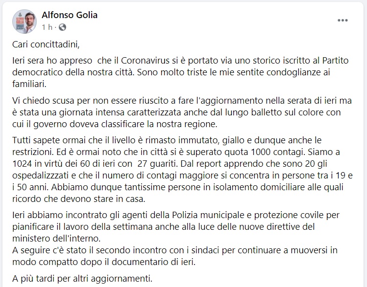 Questo quanto pubblicato sulla pagina fb del Sindaco Golia