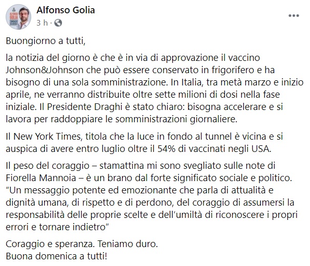 Buongiorno a tutti, la notizia del giorno è che è in via di approvazione il vaccino Johnson&Johnson che può essere conservato in frigorifero e ha bisogno di una sola somministrazione. In Italia, tra metà marzo e inizio aprile, ne verranno distribuite- si legge nella nota- oltre sette milioni di dosi nella fase iniziale. Il Presidente Draghi è stato chiaro: bisogna accelerare e si lavora per raddoppiare le somministrazioni giornaliere. Il New York Times, titola che la luce in fondo al tunnel è vicina e si auspica di avere entro luglio oltre il 54% di vaccinati negli USA. Il peso del coraggio – stamattina mi sono svegliato sulle note di Fiorella Mannoia – è un brano dal forte significato sociale e politico. “Un messaggio potente- si legge nella nota- ed emozionante che parla di attualità e dignità umana, di rispetto e di perdono, del coraggio di assumersi la responsabilità delle proprie scelte e dell’umiltà di riconoscere i propri errori e tornare indietro”. Coraggio e speranza. Teniamo duro. Buona domenica a tutti!