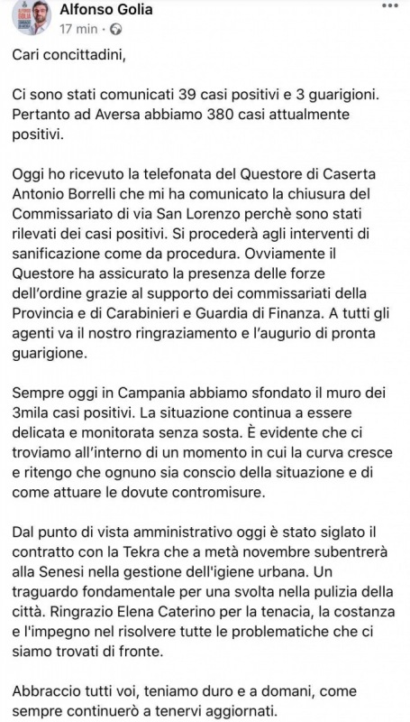 Questo quanto pubblicato sul profilo facebook del Sindaco Golia
