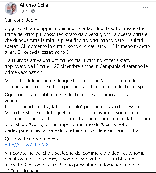 Lo apprendiamo dalla pagina Fcaebook del Sindaco di Aversa, Alfonso Golia.
