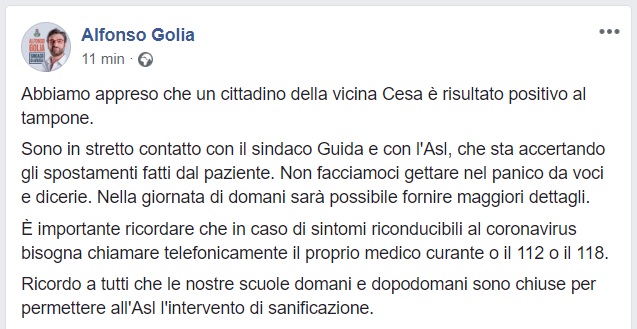 Questo quanto apprendiamo dalla pagina FB del Sindaco Golia