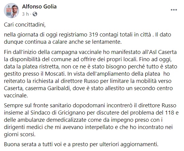 "Cari concittadini, nella giornata di oggi registriamo 319 contagi totali in città . Il dato dunque continua a calare anche se lentamente. Fin dall'inizio della campagna vaccinale ho manifestato all'Asl Caserta la disponibilità del comune ad offrire dei propri locali. Fino ad oggi, data la platea ristretta, non ce ne è stato bisogno perché- si legge nella nota- tutto è stato gestito presso il Moscati. In vista dell'ampliamento della platea ho reiterato la richiesta al direttore Russo per limitare la mobilità verso Caserta, caserma Garibaldi, dove è stato allestito un secondo centro vaccinale. Sempre sul fronte sanitario dopodomani incontrerò il direttore Russo insieme al Sindaco di Gricignano per discutere del problema del 118 e delle ambulanze demedicalizzate come da impegno preso con i dirigenti medici che mi avevano interpellato e- si legge nella nota- che ho incontrato nei giorni scorsi. Buona serata a tutti voi e a presto per ulteriori aggiornamenti."