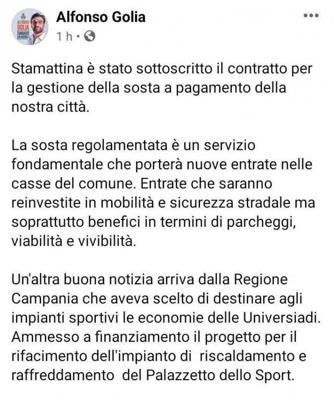 questo quanto comunicato dal Sindaco Golia