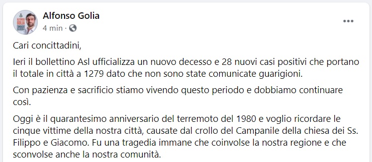 Questo quanto pubblicato sulla pagina fb del Sindaco Golia