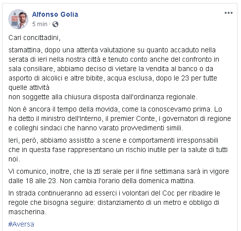 "Cari concittadini, stamattina, dopo una attenta valutazione su quanto accaduto nella serata di ieri nella nostra città e tenuto conto anche del confronto in sala consiliare, abbiamo deciso di vietare la vendita al banco o da asporto di alcolici e altre bibite, acqua esclusa, dopo le 23 per tutte quelle attività non soggette alla chiusura disposta dall'ordinanza regionale. Non è ancora il tempo della movida, come la conoscevamo prima. Lo ha detto il ministro dell'Interno, il premier Conte, i governatori di regione e colleghi sindaci che hanno varato provvedimenti simili. Ieri, però, abbiamo assistito a scene e comportamenti irresponsabili che in questa fase rappresentano un rischio inutile per la salute di tutti noi. Vi comunico, inoltre, che la ztl serale per il fine settimana sarà in vigore dalle 18 alle 23. Non cambia l'orario della domenica mattina. In strada continueranno ad esserci i volontari del Coc per ribadire le regole che bisogna seguire: distanziamento di un metro e obbligo di mascherina."