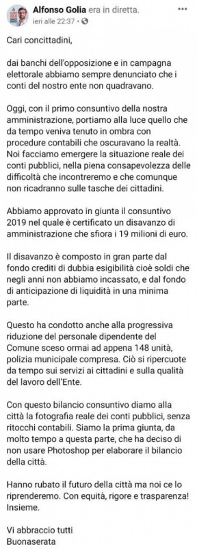 "Cari concittadini, dai banchi dell'opposizione e in campagna elettorale abbiamo sempre denunciato che i conti del nostro ente non quadravano. Oggi, con il primo consuntivo della nostra amministrazione, portiamo alla luce quello che da tempo veniva tenuto in ombra con procedure contabili che oscuravano la realtà. Noi facciamo emergere la situazione reale dei conti pubblici, nella piena consapevolezza delle difficoltà che incontreremo e che comunque non ricadranno sulle tasche dei cittadini. Abbiamo approvato in giunta il consuntivo 2019 nel quale è certificato un disavanzo di amministrazione che sfiora i 19 milioni di euro. Il disavanzo è composto in gran parte dal fondo crediti di dubbia esigibilità cioè soldi che negli anni non abbiamo incassato, e dal fondo di anticipazione di liquidità in una minima parte. Questo ha condotto anche alla progressiva riduzione del personale dipendente del Comune sceso ormai ad appena 148 unità, polizia municipale compresa. Ciò si ripercuote da tempo sui servizi ai cittadini e sulla qualità del lavoro dell’Ente. Con questo bilancio consuntivo diamo alla città la fotografia reale dei conti pubblici, senza ritocchi contabili. Siamo la prima giunta, da molto tempo a questa parte, che ha deciso di non usare Photoshop per elaborare il bilancio della città. Hanno rubato il futuro della città ma noi ce lo riprenderemo. Con equità, rigore e trasparenza! Insieme. Vi abbraccio tutti. Buonaserata".