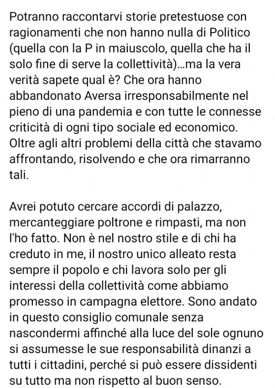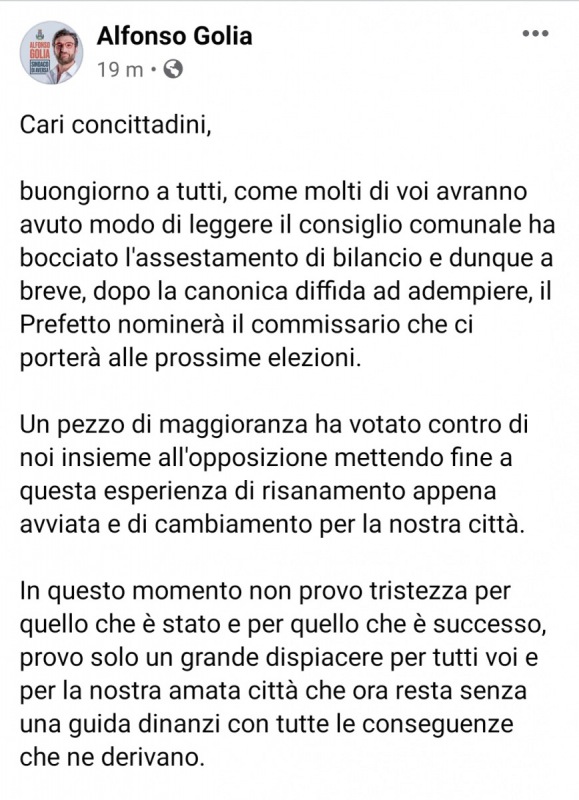 Lo apprendiamo dalla pagina Facebook del Sindaco di Aversa Alfonso Golia.