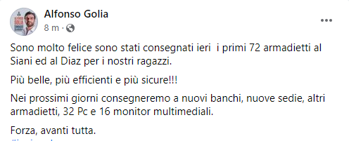 Questo il post pubblicato sulla sua pagina Facebook dal Sindaco di Aversa Alfonso Golia: "Sono molto felice sono stati consegnati ieri i primi 72 armadietti al Siani ed al Diaz per i nostri ragazzi. Più belle, più efficienti e più sicure!!! Nei prossimi giorni - si legge nel post - consegneremo nuovi banchi, nuove sedie, altri armadietti, 32 Pc e 16 monitor multimediali. Forza, avanti tutta".