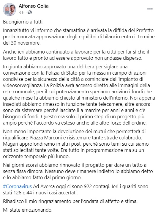 Questo quanto apprendiamo dalla pagina facebook del Sindaco Golia: