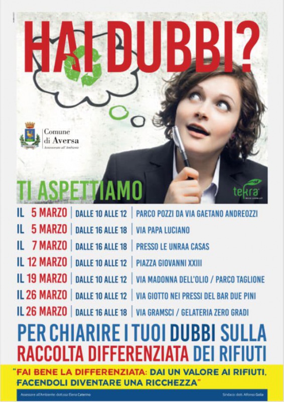 Questo il post pubblicato sulla sua pagina Facebook dal Sindaco di Aversa Alfonso Golia: "Costruire una città per tutti vuol dire lavorare tutti insieme. Migliorare la raccolta differenziata è una priorità di tutti. Insieme sempre insieme - si legge nel post - siamo una bellissima comunità ed ognuno sono certo farà la sua parte. Ci vediamo in piazza!!! Viva Aversa".