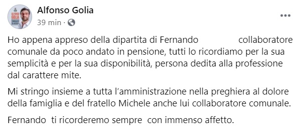 Ho appena appreso della dipartita di Fernando ... collaboratore comunale da poco andato in pensione, tutti lo ricordiamo per la sua semplicità e per la sua disponibilità, persona dedita alla professione dal carattere mite. Mi stringo- si legge nella nota- insieme a tutta l’amministrazione nella preghiera al dolore della famiglia e del fratello Michele anche lui collaboratore comunale. Fernando ti ricorderemo sempre con immenso affetto.
