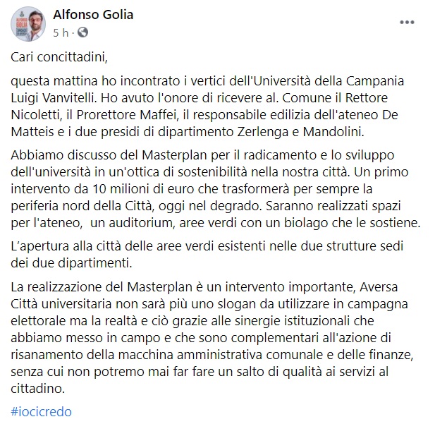 "Cari concittadini, questa mattina ho incontrato i vertici dell'Università della Campania Luigi Vanvitelli. Ho avuto l'onore di ricevere al Comune il Rettore Nicoletti, il Prorettore Maffei, il responsabile edilizia dell'ateneo De Matteis e i due presidi di dipartimento Zerlenga e Mandolini. -Si legge nella nota- Abbiamo discusso del Masterplan per il radicamento e lo sviluppo dell'università in un'ottica di sostenibilità nella nostra città. Un primo intervento da 10 milioni di euro che trasformerà per sempre la periferia nord della Città, oggi nel degrado. Saranno realizzati spazi per l'ateneo, un auditorium, aree verdi con un biolago che le sostiene. L’apertura alla città delle aree verdi esistenti nelle due strutture sedi dei due dipartimenti. -Si legge nella nota- La realizzazione del Masterplan è un intervento importante, Aversa Città universitaria non sarà più uno slogan da utilizzare in campagna elettorale ma la realtà e ciò grazie alle sinergie istituzionali che abbiamo messo in campo e che sono complementari all'azione di risanamento della macchina amministrativa comunale e delle finanze, senza cui non potremo mai far fare un salto di qualità ai servizi al cittadino."