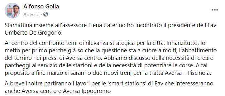 "Stamattina insieme all'assessore Elena Caterino ho incontrato il presidente dell'Eav Umberto De Grogorio. Al centro del confronto temi di rilevanza strategica per la città. Innanzitutto, lo metto per primo perché già so che la questione sta a cuore a molti, l'abbattimento- si legge nella nota- del torrino nei pressi di Aversa centro. Abbiamo discusso della necessità di creare parcheggi al servizio delle stazioni e della necessità di potenziare le corse. A tal proposito a fine marzo ci saranno due nuovi trenj per la tratta Aversa - Piscinola. A breve inoltre partiranno i lavori per le 'smart stations' di Eav che interesseranno- si legge nella nota- anche Aversa centro e Aversa Ippodromo"