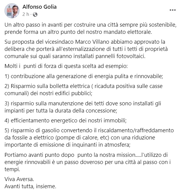 "Un altro passo in avanti per costruire una città sempre più sostenibile, prende forma un altro punto del nostro mandato elettorale. Su proposta del vicesindaco Marco Villano abbiamo approvato la delibera che porterà all’esternalizzazione di tutti i tetti di proprietà comunale sui quali saranno installati pannelli fotovoltaici. -Si legge nella nota- Molti i punti di forza di questa scelta ad esempio: 1) contribuzione alla generazione di energia pulita e rinnovabile; 2) Risparmio sulla bolletta elettrica ( ricaduta positiva sulle casse comunali) dei nostri edifici pubblici; 3) risparmio sulla manutenzione dei tetti dove sono installati gli impianti per tutta la durata della concessione; 4) efficientamento energetico dei nostri immobili; -Si legge nella nota- 5) risparmio di gasolio convertendo il riscaldamento/raffreddamento da fossile a elettrico (pompe di calore, etc) con una riduzione importante di emissione di inquinanti in atmosfera; Portiamo avanti punto dopo punto la nostra mission.....l’utilizzo di energie rinnovabili è un passo doveroso per una città al passo con i tempi. Viva Aversa. Avanti tutta, insieme."