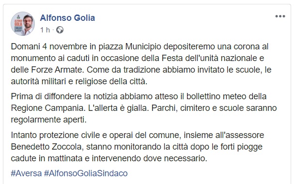 Questo quanto apprendiamo dalla pagina FB del Sindaco Golia
