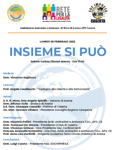 Lunedì alle 17 ad Aversa, al salone della Caritas diocesana, la presentazione del progetto 'La cultura della legalità'. L'evento è organizzato dall'Associazione 'Ambulatorio Antiracket e Antiusura Terra di Lavoro - Asp Caserta' presieduta da Maurizio Pollini ed ha l’obiettivo di presentare agli organi istituzionali ed ecclesiastici della Provincia di Caserta il programma dell’Associazione per le attività di quest’anno. Tutti i Vescovi della provincia di Caserta, che sono invitati all'evento, saranno nominati Presidenti onorari dell'Associazione per sottolineare l'importanza della collaborazione anche con la chiesa cattolica, nella lotta al Racket e nell'aiuto agli imprenditori che ne sono colpiti.
