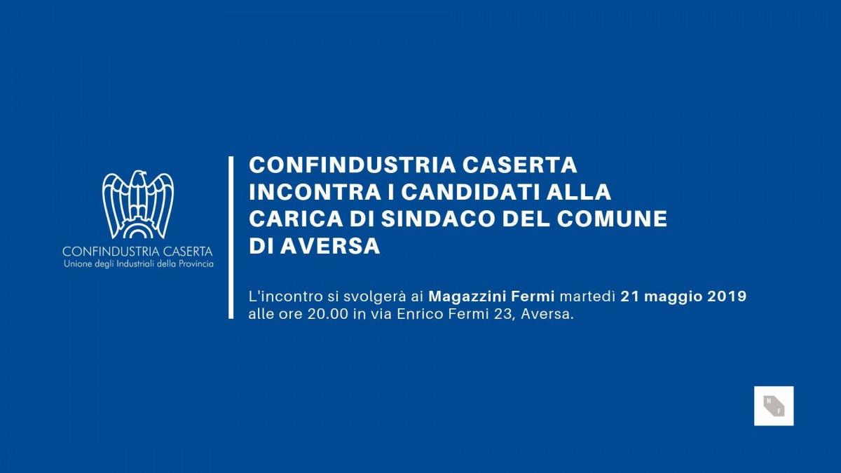 "Confindustria Caserta, in occasione delle prossime elezioni amministrative in programma il 26 maggio, ha organizzato un incontro con i candidati alla carica di Sindaco della città di Aversa, che si terrà nella città normanna martedì 21 alle ore 20 presso i Magazzini Fermi (via Enrico Fermi, 23). Si legge nel comunicato. Al confronto, che è aperto al pubblico, sono stati invitati tutti i candidati a Sindaco. Hanno già confermato la propria presenza Alfonso Golia, Gianluca Golia, Roberto Romano, Giuseppe Stabile. Durante questo appuntamento sarà possibile formulare delle domande ai candidati alla carica di Sindaco, - si legge nel comunicato - i quali avranno l’opportunità di illustrare ai presenti le linee programmatiche dei rispettivi programmi."