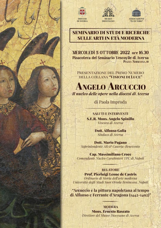 Questo il comunicato stampa diffuso dalla Diocesi di Aversa: "In occasione dell’evento, in programma al Seminario Vescovile, verrà presentato il libro di Paola Improda su Angelo Arcuccio, primo volume della collana “Visioni di Luce”del Museo Diocesano. Mercoledì 5 ottobre 2022, alle ore 16.30, si terrà il primo incontro del Seminario di Studi e Ricerche sulle Arti in Età Moderna promosso dal Museo Diocesano di Aversa, in collaborazione con l’Associazione culturale ‘In Octabo’. In occasione dell’evento - si legge nel comunicato - che si svolgerà presso la Pinacoteca del Seminario Vescovile di Aversa, verrà ufficialmente presentato il volume di Paola Improda, “Angelo Arcuccio: il nucleo delle opere nella diocesi di Aversa”. Il libro costituisce anche il primo numero della collana “Visioni di Luce” del Museo Diocesano, curata da Mons. Ernesto Rascato, a cui spetterà il compito di introdurre e moderare l’incontro. Relatore d’eccezione - prosegue il comunicato - sarà il prof. Pierluigi Leone de Castris, ordinario di Storia dell'arte moderna presso l’Università degli Studi Suor Orsola Benincasa di Napoli, che terrà una relazione su “Arcuccio e la pittura napoletana al tempo di Alfonso e Ferrante d'Aragona (1442-1492)”. Previsti anche - si legge ancora nel comunicato - gli interventi del vescovo di Aversa, S.E.R. Mons. Angelo Spinillo; del sindaco, dott. Alfonso Golia; del soprintendente ABAP Caserta-Benevento, dott. Mario Pagano; del capitano del nucleo dei Carabinieri TPC di Napoli, Massimiliano Croce. A proposito del testo su Arcuccio, esso si pone - prosegue ancora il comunicato - come il primo catalogo completo delle opere che il pittore napoletano ha lasciato nel territorio della diocesi di Aversa. “Con lo studio delle fonti documentarie e letterarie - afferma l’autrice - e con una particolare attenzione al contesto locale e alla committenza, nel volume ho voluto chiarire e ricostruire le iconografie, la cronologia e le provenienze delle opere aversane del pittore, munendo il libro - recita ancora il comunicato - di un apparato fotografico notevole e particolareggiato".