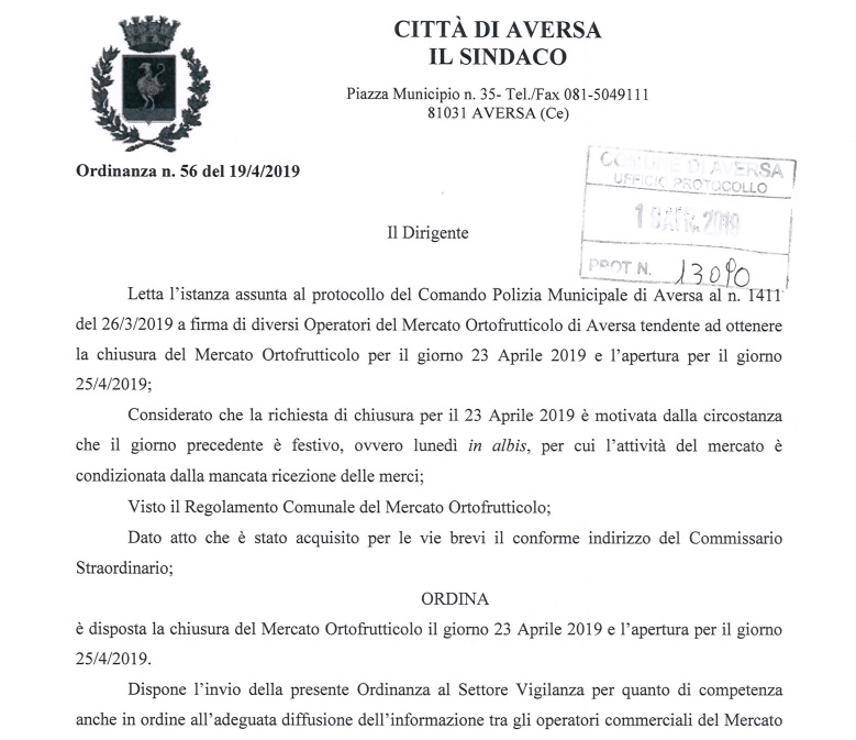 Questa l'ordinanza con la quale il Comune di Aversa ha autorizzato la chiusura del mercato ortofrutticolo per martedì 23 aprile.