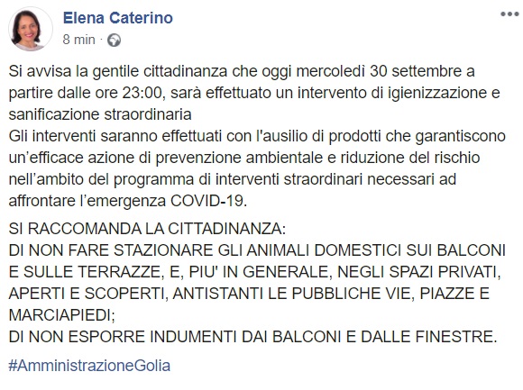 Questo quanto apprendiamo dalla pagina facebook del Ass. Caterino: