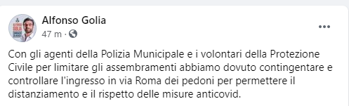 Questo il post pubblicato dal Sindaco di Aversa Alfonso Golia sulla sua pagina Facebook: "Con gli agenti della Polizia Municipale e i volontari della Protezione Civile - si legge nel post - per limitare gli assembramenti abbiamo dovuto contingentare e controllare l'ingresso in via Roma dei pedoni per permettere - conclude il post - il distanziamento e il rispetto delle misure anticovid".
