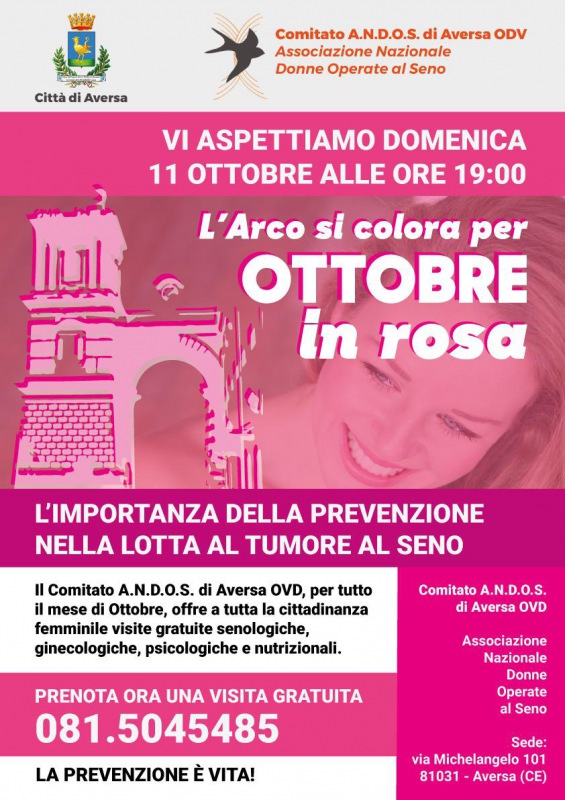 "L’Arco dell’Annunziata, Porta Napoli, simbolo della città di Aversa si illumina di rosa per celebrare il mese della prevenzione promosso dall’Andos Comitato di Aversa Odv. Una iniziativa che si svolge con il pieno supporto dell’amministrazione comunale guidata dal sindaco Alfonso Golia che-spiega la nota- ha concesso il patrocinio all’Ottobre rosa, organizzato dall’Associazione Nazionale donne operate al seno. A partire da domenica 11 dalle ore 19,00 il monumento sarà illuminato per ricordare a tutte e a tutti che la prevenzione è elemento fondamentale dei percorsi sanitari e di cura, ch-spiega la nota-e con diagnosi precoci si difende la propria salute e la qualità della propria vita. L’A.N.D.O.S., per l’intera durata del ‘mese della prevenzione’, ha organizzato, presso la propria sede di via Michelangelo 101 ad Aversa, per tutta la cittadinanza femminile una serie di visite specialistiche completamente gratuite: Senologiche, Ginecologiche, Psicologiche e nutrizionali."