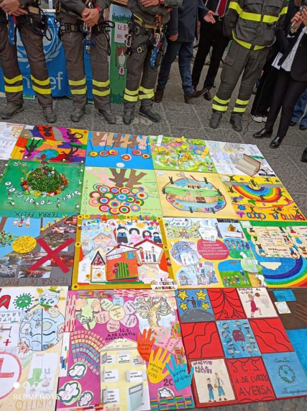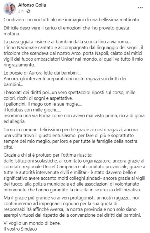"Condivido con voi tutti alcune immagini di una bellissima mattinata. Difficile descrivere il carico di emozioni che ho provato questa mattina. La passeggiata insieme ai bambini dalla scuola fino a via roma... L’inno Nazionale cantato e accompagnato dal linguaggio dei segni , il tricolore che scendeva dal nostro Arco, porta Napoli, calato dai mitici vigili del fuoco ambasciatori Unicef nel mondo, ai quali va tutto il mio ringraziamento. -Si legge nella nota- Le poesie di Aurora lette dai bambini... Ancora, gli interventi preparati dai nostri ragazzi sui diritti dei bambini... I basolati dei diritti poi...un vero spettacolo! riposti sul corso, mille colori, ricchi di sogni e aspettative. I palloncini, il mago con le sue magie.... il ludubus con mille giochi..... insomma una via Roma come non avevo mai visto prima, ricca di gioia ed allegria. Torno in comune felicissimo perché grazie ai nostri ragazzi, ancora una volta trovo il giusto entusiasmo per fare di più e soprattutto sempre del mio meglio, per loro e per tutte le famiglie della nostra città. -Si legge nella nota- Grazie a chi si è profuso per l’ottima riuscita: dalle Istituzioni scolastiche, al comitato organizzatore, ancora grazie al comitato regionale Unicef Campania e al comitato provinciale, grazie a tutte le autorità intervenute civili e militari- è stato davvero bello e significativo avere accanto molti colleghi sindaci- ancora grazie ai vigili del fuoco, alla polizia municipale ed alle associazioni di volontariato intervenute che hanno garantito la riuscita in sicurezza dell’iniziativa. -Si legge nella nota- Ma il grazie più grande va ai veri protagonisti, ai nostri ragazzi... noi continueremo ad impegnarci ognuno per la sua quota di responsabilità affinché Aversa, la nostra provincia e non solo siano esempi virtuosi del rispetto della convenzione dei diritti dei bambini. Vi voglio un mondo di bene. Il vostro Sindaco"