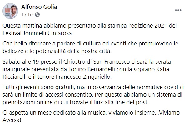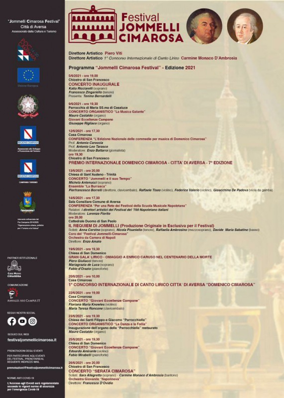 Questo quanto apprendiamo dalla pagina fb del Sindaco Golia: "Abbiamo presentato alla stampa l’edizione 2021 del Festival Jommelli Cimarosa. Che bello ritornare a parlare di cultura ed eventi che promuovono le bellezze e le potenzialità della nostra città. Sabato alle 19 presso il Chiostro di San Francesco - si legge nella nota - ci sarà la serata inaugurale presentata da Tonino Bernardelli con la soprano Katia Ricciarelli e il tenore Francesco Zingariello. Tutti gli eventi sono gratuiti, ma in osservanza delle normative covid ci sarà un limite di accessi consentito. Per questo abbiamo un sistema di prenotazioni online di cui trovate il link alla fine del post CLICCA QUI. Ci aspetta un mese dedicato alla musica, viviamolo insieme…Viviamo Aversa!"