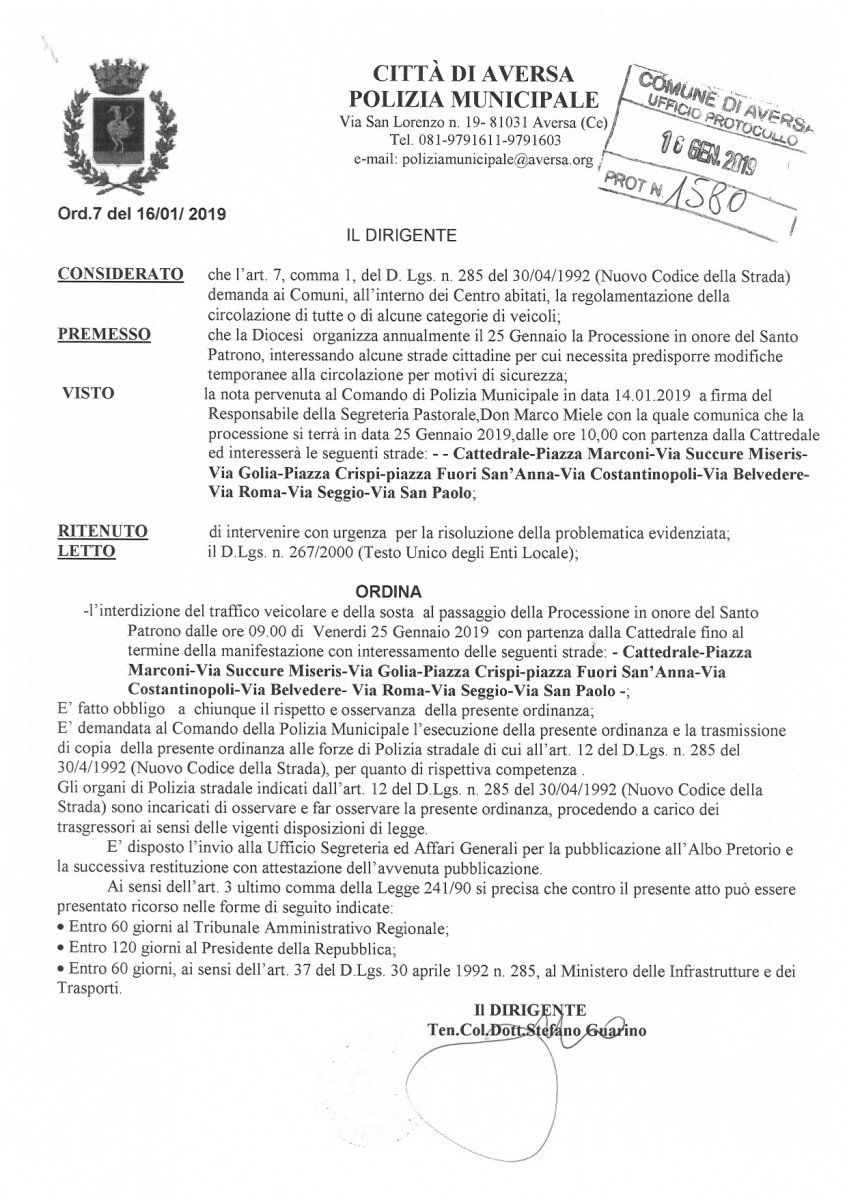 In vista della processione del 25 gennaio in onore del Santo Patrono di Aversa, il Comune ha pubblicato sul proprio portale la seguente ordinanza