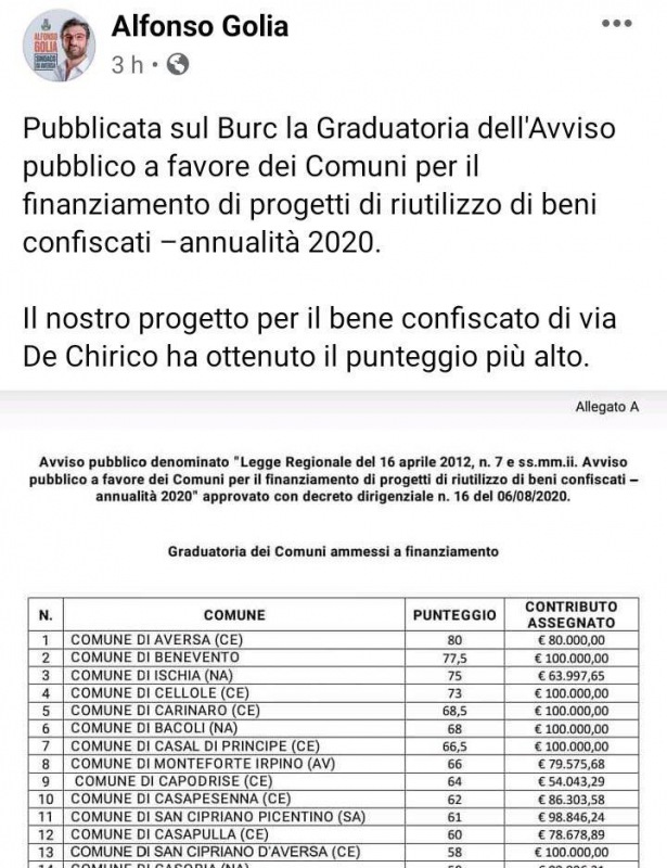 Aversa. Progetti di riutilizzo di beni confiscati. Golia: "Il nostro ha ottenuto il punteggio più alto"