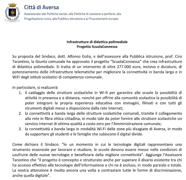 Pubblichiamo nota stampa del Comune di Aversa: