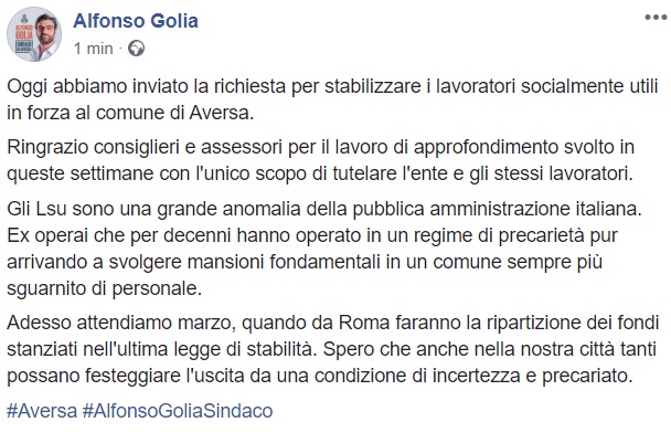 Questo quanto apprendiamo dalla pagina facebook del Sindaco Golia: