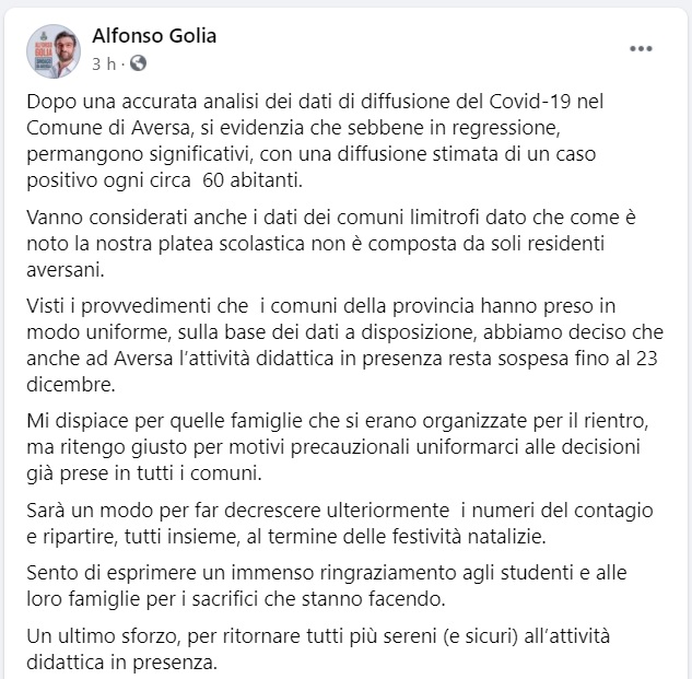 Questo quanto pubblicato su fb dal Sindaco Golia