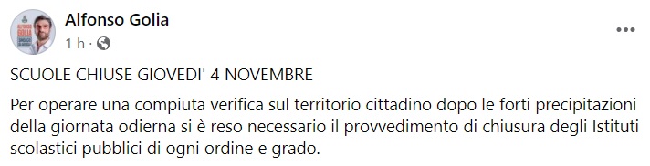 Questo quanto apprendiamo dalla pagina fb del Sindaco di Aversa Golia: "SCUOLE CHIUSE GIOVEDI' 4 NOVEMBRE Per operare una compiuta verifica sul territorio cittadino dopo le forti precipitazioni della giornata odierna si è reso necessario il provvedimento di chiusura degli Istituti scolastici pubblici di ogni ordine e grado."