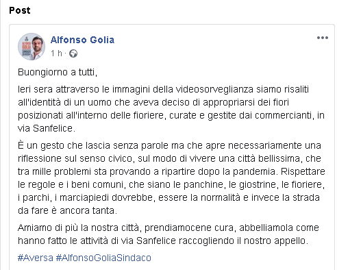 "Buongiorno a tutti, Ieri sera attraverso le immagini della videosorveglianza siamo risaliti all'identità di un uomo che aveva deciso di appropriarsi dei fiori posizionati all'interno delle fioriere, curate e gestite dai commercianti, in via Sanfelice. È un gesto che lascia senza parole ma che apre necessariamente una riflessione sul senso civico, sul modo di vivere una città bellissima, che tra mille problemi sta provando a ripartire dopo la pandemia. Rispettare le regole e i beni comuni, che siano le panchine, le giostrine, le fioriere, i parchi, i marciapiedi dovrebbe, essere la normalità e invece la strada da fare è ancora tanta. Amiamo di più la nostra città, prendiamocene cura, abbelliamola come hanno fatto le attività di via Sanfelice raccogliendo il nostro appello."