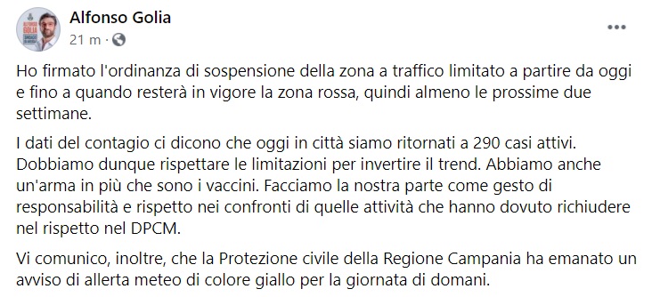 "Ho firmato l'ordinanza di sospensione della zona a traffico limitato a partire da oggi e fino a quando resterà in vigore la zona rossa, quindi almeno le prossime due settimane. I dati del contagio ci dicono che oggi in città siamo ritornati a 290 casi attivi. -Si legge nella nota- Dobbiamo dunque rispettare le limitazioni per invertire il trend. Abbiamo anche un'arma in più che sono i vaccini. -Si legge nella nota- Facciamo la nostra parte come gesto di responsabilità e rispetto nei confronti di quelle attività che hanno dovuto richiudere nel rispetto nel DPCM. Vi comunico, inoltre, che la Protezione civile della Regione Campania ha emanato un avviso di allerta meteo di colore giallo per la giornata di domani."