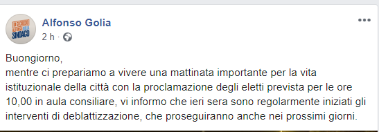 Questo il post pubblicato sulla bacheca Facebook del Sindaco di Aversa Alfonso Golia: