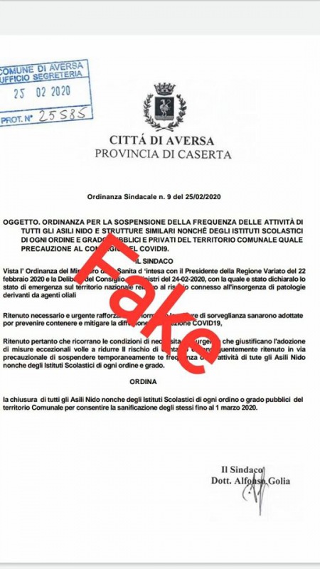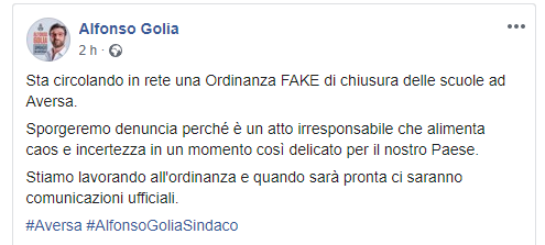 "Sta circolando in rete una Ordinanza FAKE di chiusura delle scuole ad Aversa. Sporgeremo denuncia perché è un atto irresponsabile che alimenta caos e incertezza in un momento così delicato per il nostro Paese. Stiamo lavorando all'ordinanza e quando sarà pronta ci saranno comunicazioni ufficiali."