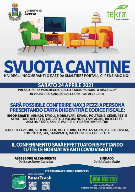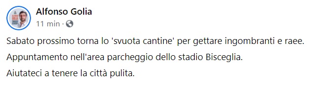 Questo quanto apprendiamo dalla pagina fb del Sindaco Golia: "Sabato prossimo torna lo 'svuota cantine' per gettare ingombranti e raee. Appuntamento nell'area parcheggio dello stadio Bisceglia. Aiutateci a tenere la città pulita."