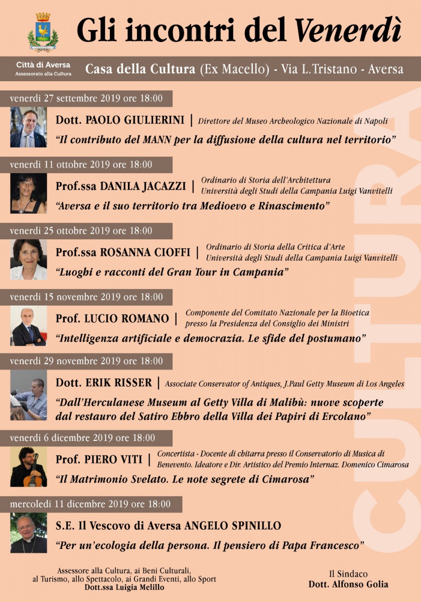 "L’Assessorato alla Cultura della Città di Aversa presenta “Gli incontri del Venerdì”, ciclo di conferenze dedicato ad arte, cultura, musica, temi laici e cattolici. Parteciperanno, a titolo gratuito Paolo Giulierini, Direttore del Museo Archeologico di Napoli; la docente universitaria e profonda conoscitrice della realtà aversana Danila Jacazzi; la Storica dell’Arte Rosanna Cioffi; - si legge nel comunicato - il Prof. Lucio Romano, componente del Comitato Nazionale per la Bioetica; Il Dott. Erik Risser del J.P. Getty Museum di Los Angeles; Piero Viti concertista e Docente di chitarra al Conservatorio di Musica di Benevento e Sua Eminenza il Vescovo di Aversa Angelo Spinillo. Un parterre d’eccezione come sottolineato dall’Assessore alla Cultura Luisa Melillo: “personalità di rilievo nazionale e internazionale, - si legge nel comunicato - miniere di conoscenza nei rispettivi ambiti. Sarà un piacere ascoltarli. Li ringrazio della presenza così come ringrazio il Dott. Erik Riser e il J.P. Getty Museum di Los Angeles che presenterà in anteprima mondiale ad Aversa i risultati degli studi e le nuove scoperte da restauro dal Satiro Ebbro della Villa dei Papiri di Ercolano. Saranno sette incontri davvero interessanti e invito tutti a partecipare”. Si legge nel comunicato. Si legge nel comunicato. Appuntamenti da non perdere come sottolinea anche il Sindaco di Aversa. Alfonso Golia: “E’ un grande onore per Aversa ospitare un ciclo di conferenze di questo livello. Rivivremo la storia di Aversa tra Medioevo e Rinascimento, luoghi e simboli del nostro territorio. Ascolteremo le note segrete di Cimarosa, ci confronteremo su come diffondere la cultura in una società che tende ad essere sempre più virtuale. Si legge nel comunicato. Infine, il fatto che uno dei più prestigiosi musei al mondo presenti ad Aversa in anteprima mondiale i risultati di studi così importanti, ci onora particolarmente”. Si legge nel comunicato. Tutti gli incontri si svolgeranno presso la “Casa della Cultura” (Ex Macello) alle ore 18 (eccezion fatta per l’ultimo appuntamento che si terrà mercoledì 11 dicembre) in Via Tristano ad Aversa. Ingresso gratuito fino ad esaurimento posti."
