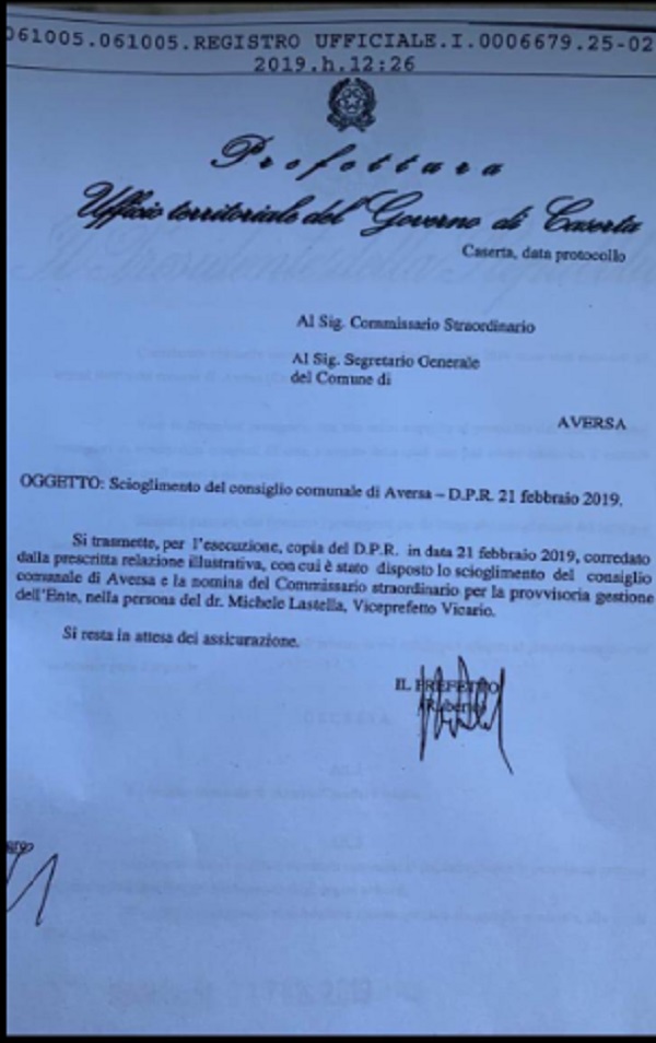 Questo il documento della Prefettura che sancisce lo scioglimento del Consiglio Comunale di Aversa.