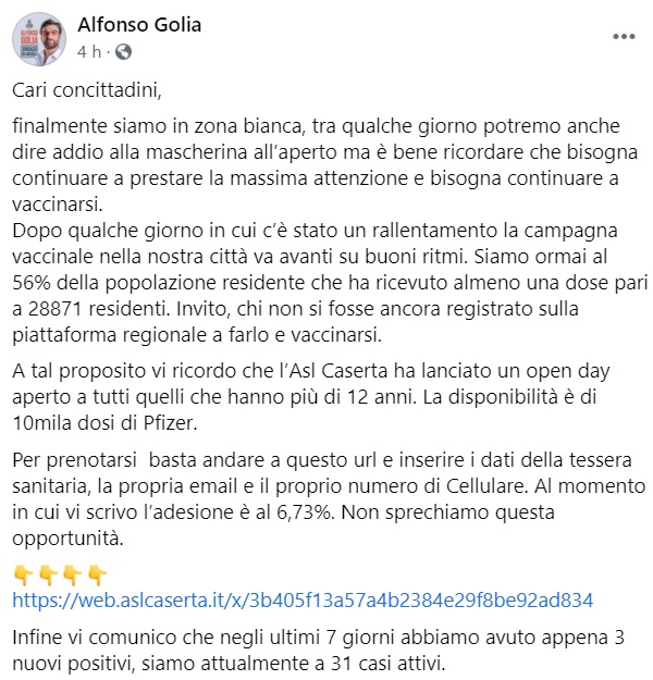 "Cari concittadini, finalmente siamo in zona bianca, tra qualche giorno potremo anche dire addio alla mascherina all’aperto ma è bene ricordare che bisogna continuare a prestare la massima attenzione e bisogna continuare a vaccinarsi. Dopo qualche giorno in cui c’è stato un rallentamento la campagna vaccinale nella nostra città va avanti- si legge nella nota- su buoni ritmi. Siamo ormai al 56% della popolazione residente che ha ricevuto almeno una dose pari a 28871 residenti. Invito, chi non si fosse ancora registrato sulla piattaforma regionale a farlo e vaccinarsi. A tal proposito vi ricordo che l’Asl Caserta ha lanciato un open day aperto a tutti quelli che hanno più di 12 anni. La disponibilità è di 10mila dosi di Pfizer. Per prenotarsi basta andare a questo url e inserire i dati della tessera sanitaria, la propria email e il proprio numero di Cellulare. Al momento in cui vi scrivo l’adesione è al 6,73%. Non sprechiamo questa opportunità. Infine- si legge nella nota- vi comunico che negli ultimi 7 giorni abbiamo avuto appena 3 nuovi positivi, siamo attualmente a 31 casi attivi."