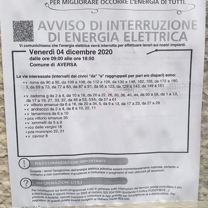 Apprendiamo da questo avviso che venerdì 4 dicembre ad Aversa vi sarà l'interruzione di energia elettrica dalle ore 9:00 alle ore 16:50. Queste tutte le strade interessate.